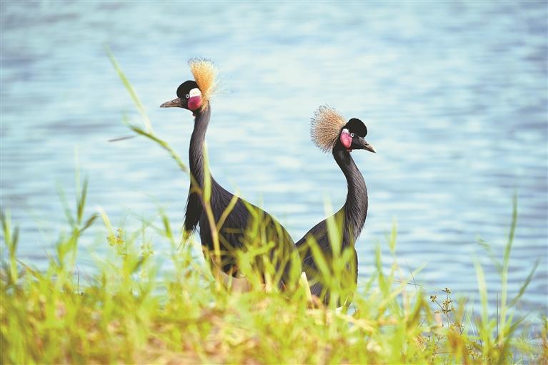 近日,两只黑冠鹤造访九围湿地公园,吸引大量观鸟爱好者前往观赏。据悉,黑冠鹤主要产于非洲,是尼日利亚的国鸟,其体态高雅,羽色别致,枕部具无数条土黄色绒丝向四周放射形成冠羽,是珍贵的观赏禽类。两只黑冠鹤形影不离,在湿地内散步、觅食,不时引吭振翅。黑冠鹤因遵从“夫妻终身制”,也被称为“爱情鸟”。