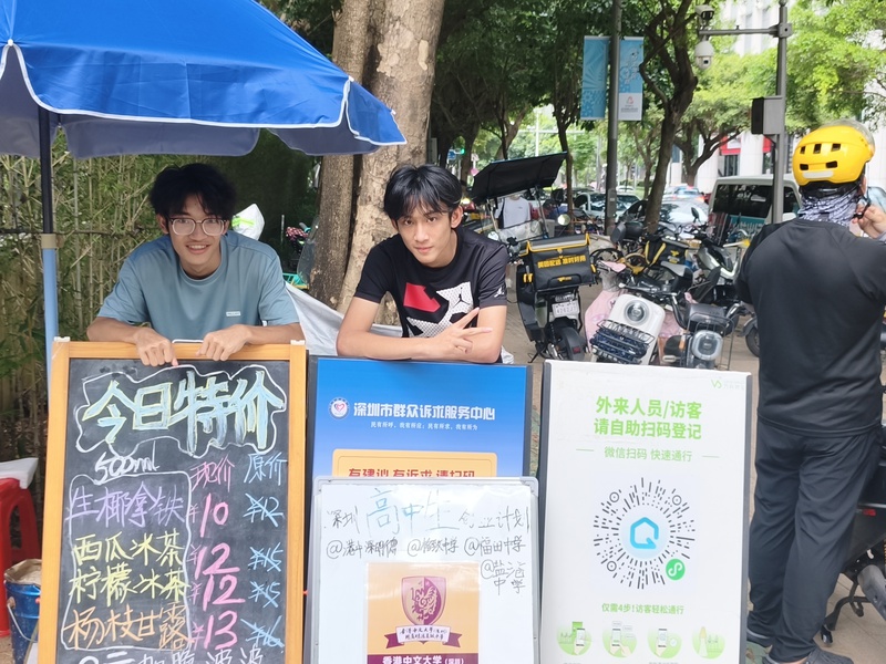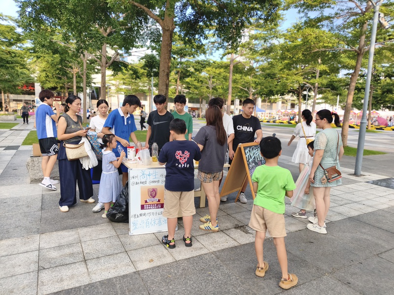 8月2日的深圳书城中心城北区,比往常更添了几分热闹与生涩。八名身穿深圳校服的高中生正忙碌穿梭于一个不大的茶饮摊之间:有人手抖着往杯子里加冰块,另一人则提高嗓门招呼路过的顾客。