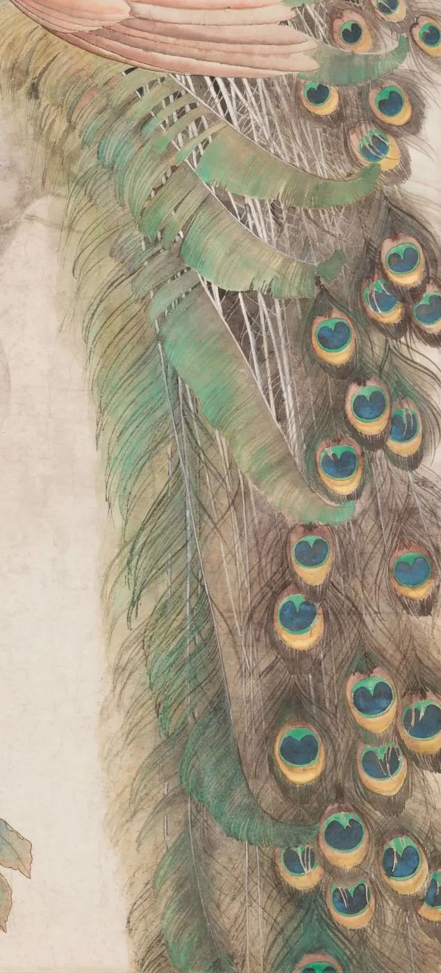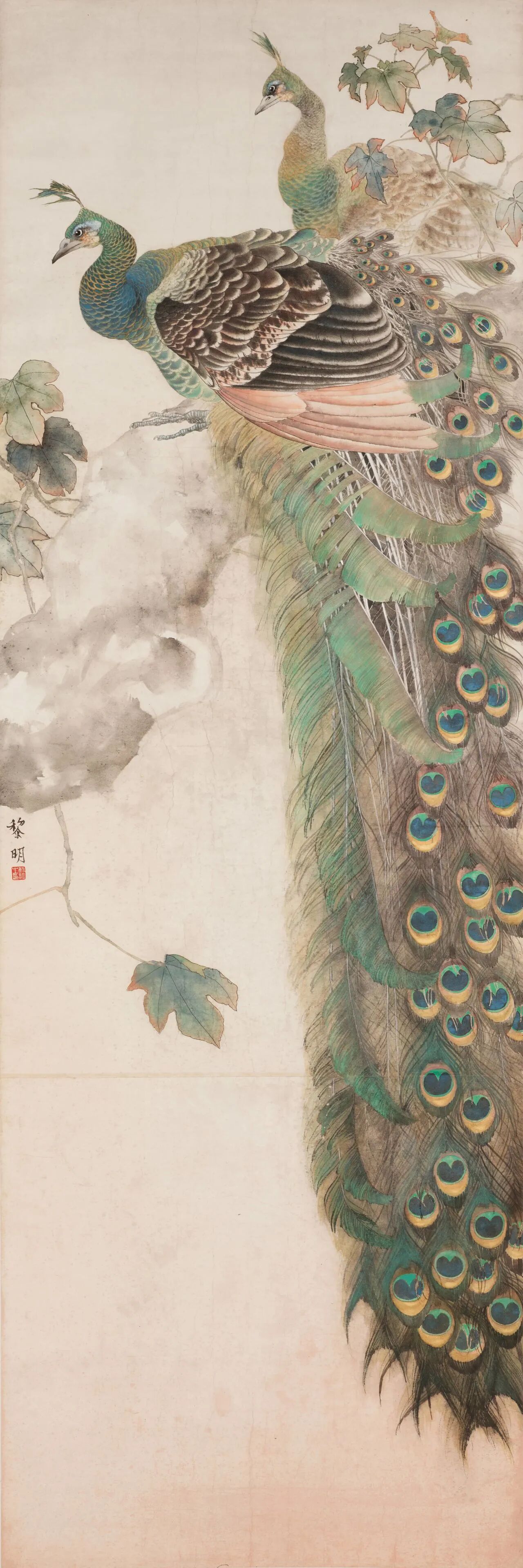 刚刚上新的香港艺术馆藏《孔雀》描绘了一对孔雀,画面以雄孔雀为主,栖息于树干,尾羽顺势垂下,构图修长秀丽。孔雀头颈自然生动,翠绿色羽毛闪耀着金色和蓝色光泽,延伸至背部逐渐转变为赭色,翼部褐色羽毛丰满有力,富有层次,最绚烂的尾羽翠中有蓝,眼形斑点采用水彩画法,色彩明亮、通透,尾羽下白色的羽管若隐若现,尾部羽毛巧妙地将中国水墨笔法与水彩画法融合,用水墨线条表现羽丝的流动、柔顺,以水彩画法突出尾羽的色泽。树干以水墨写意画成,衬托孔雀的五彩斑斓。黎明运用西画的块面处理方法,使孔雀造型生动逼真,又巧妙融合,画面清新自然。“相较中国古代画家、日本画家的孔雀画,黎明的孔雀体型饱满,姿态生动,羽色更显明翠,青、绿、紫、赭、黄过渡自然。”陈旭霞认为,“纵观黎明的孔雀图,风格跨度大,笔法收放自如,在历代善画孔雀的画家中,独树一帜,值得一赏。”