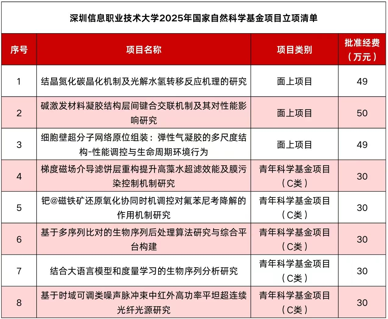 2025年国家自然科学基金项目评审结果日前正式公布,记者从深圳信息职业技术大学获悉,该校共有8个项目获批立项,其中包括面上项目3项、青年科学基金(C类)项目5项,批准经费共计298万元。