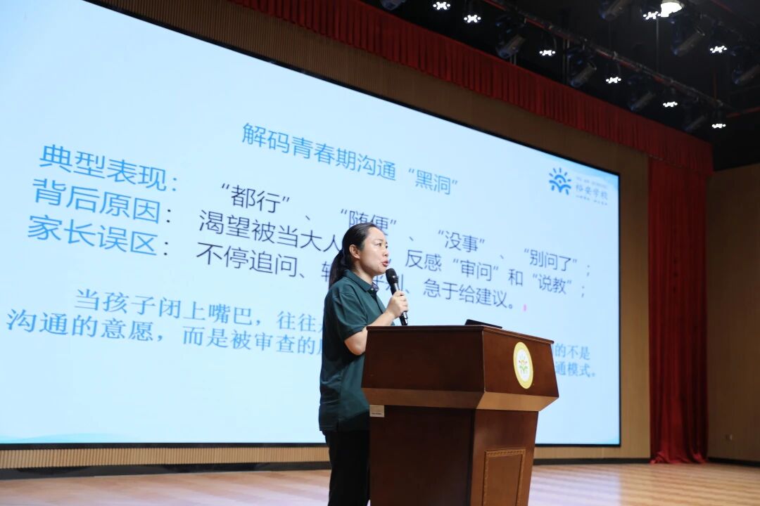 面向初一新生家长,朱婷老师以“同心同行,守望青春”为主题指导家长,帮助孩子们顺利过渡到初中生活。讲座聚焦三大核心:一是解码青春期,解析中小学阶段差异及孩子情绪波动、自主渴望等心理特点;二是引导家长角色升级,从 “管理者” 转为 “教练”,传授非暴力沟通、聚焦过程管理、培养成长型思维等方法;三是构建家校协同机制,明确信息共享、统一教育策略的重要性,规范沟通路径并提示需立即联系学校的 “危险信号”,凝聚家校合力,助力初一新生平稳适应青春期与初中生活。