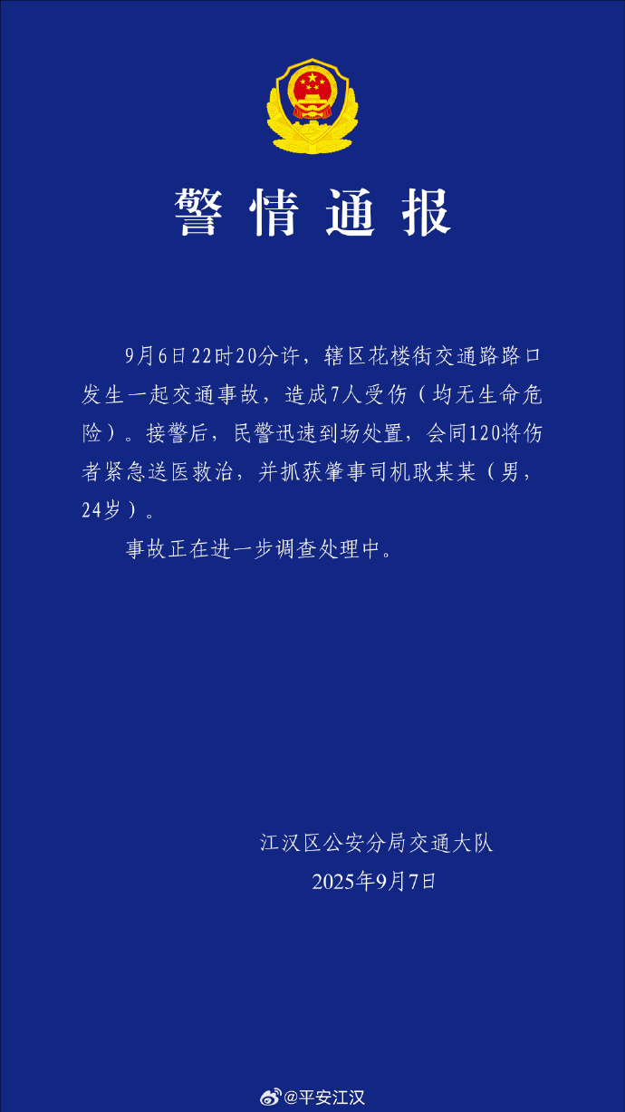 江汉区公安分局交警大队9月7日凌晨发布警情通报: