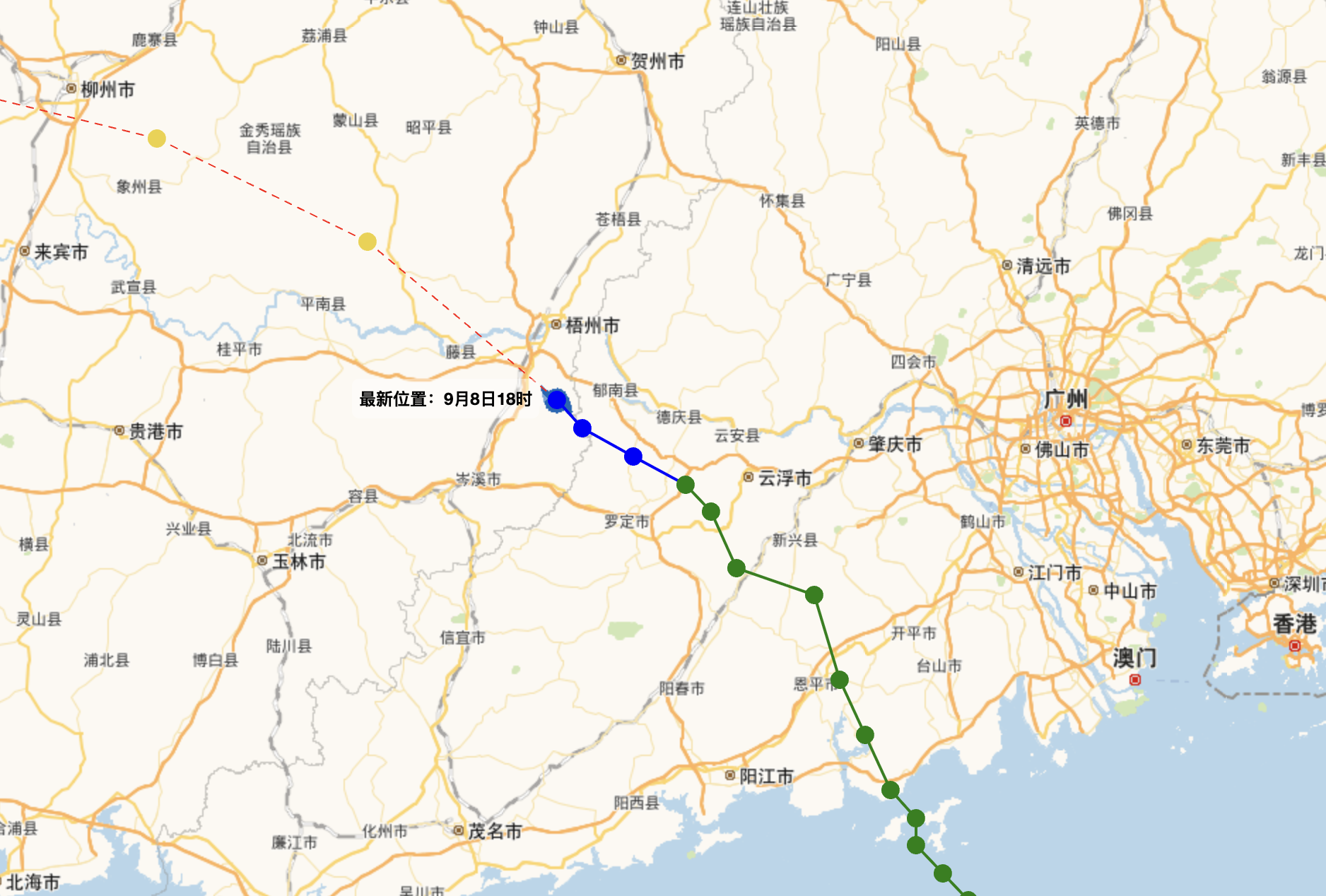 9月8日18时,“塔巴”中心已经从广东移入广西。中央气象台台风网截图
