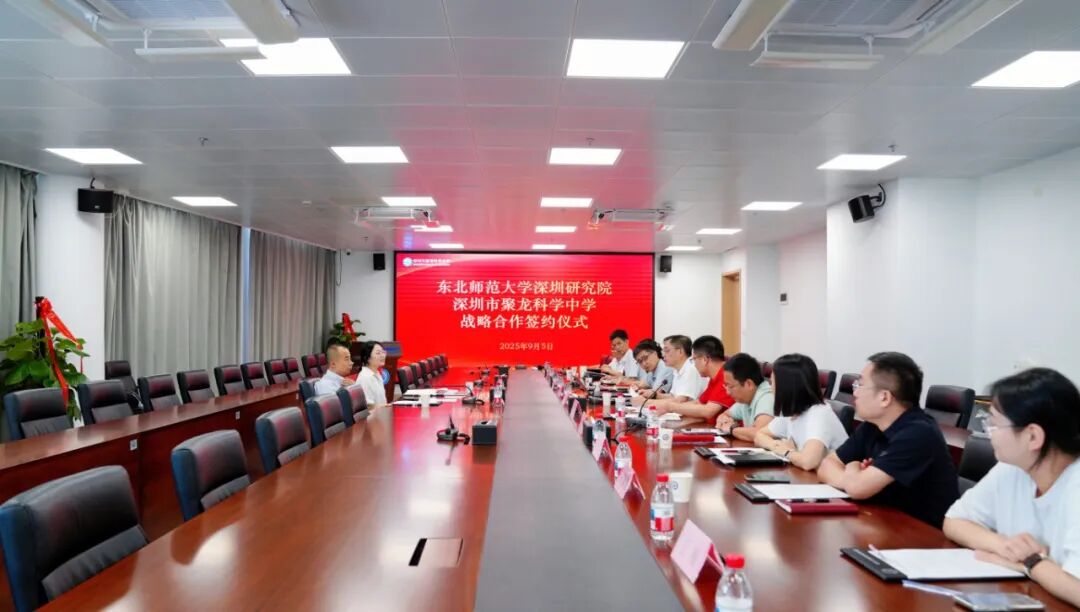 为深入贯彻《教育强国建设规划纲要(2024-2035年)》精神,深化学校综合改革,打造科学教育优质特色高中,探索科教协同育人机制,2025年9月5日,东北师范大学深圳研究院与深圳市聚龙科学中学进行了合作签约仪式。仪式在深圳市聚龙科学中学举行,东北师范大学深圳研究院执行院长高宗泽、深圳市聚龙科学中学校长鲍方遒代表双方进行交流并签署协议。