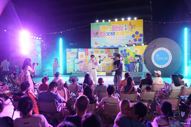 夜幕降临,“GO音浪-新安音乐造浪潮流音乐会”将活动推向了高潮。实力乐队与音乐人轮番登台献艺,流行、摇滚、民谣等多元曲风交替上演,为现场观众带来了一场沉浸式夜间音乐盛宴。“音乐太好听了,现场氛围特别棒,我完全沉浸其中,特别享受!” 一位市民难掩激动之情。