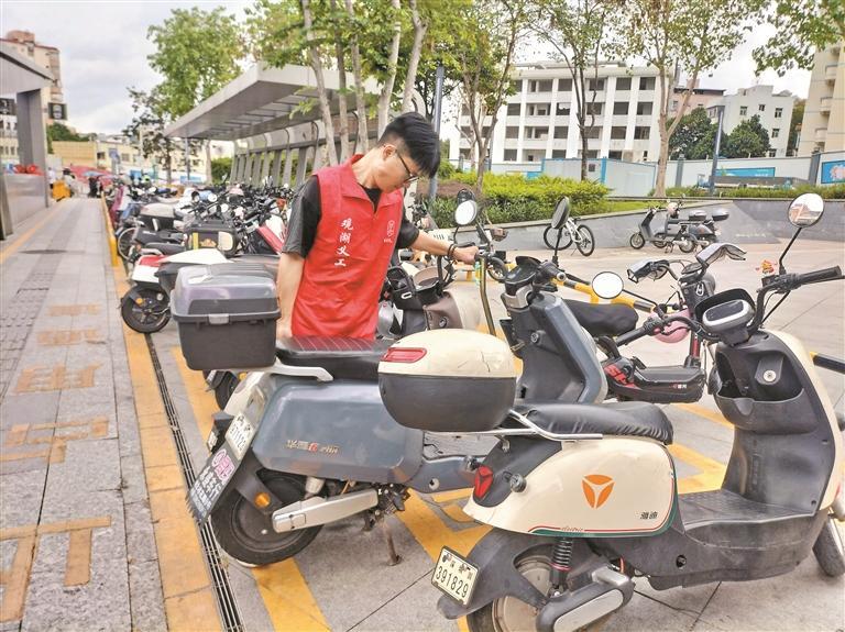 ▲志愿者在地铁4号线松元厦站附近将电动自行车整齐摆放。