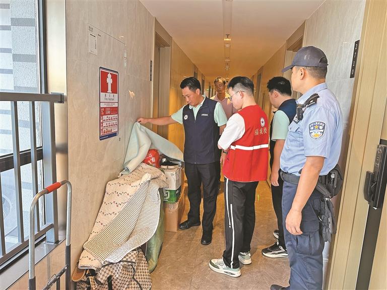 ▲福城街道“警网楼”联动对开放式公寓开展安全巡查。