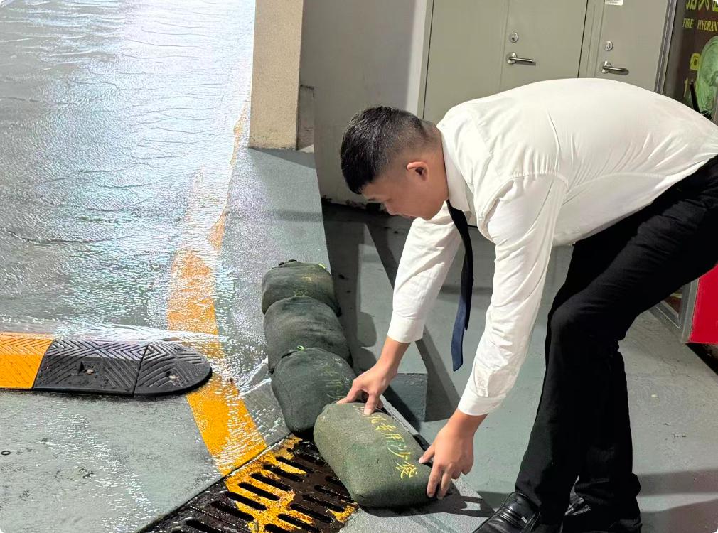 台风暴雨夜,中旅联合物业服务的联合广场全员出击,在狂风骤雨中持续奋战,排查隐患,搬运沙袋,为写字楼筑牢安全屏障。