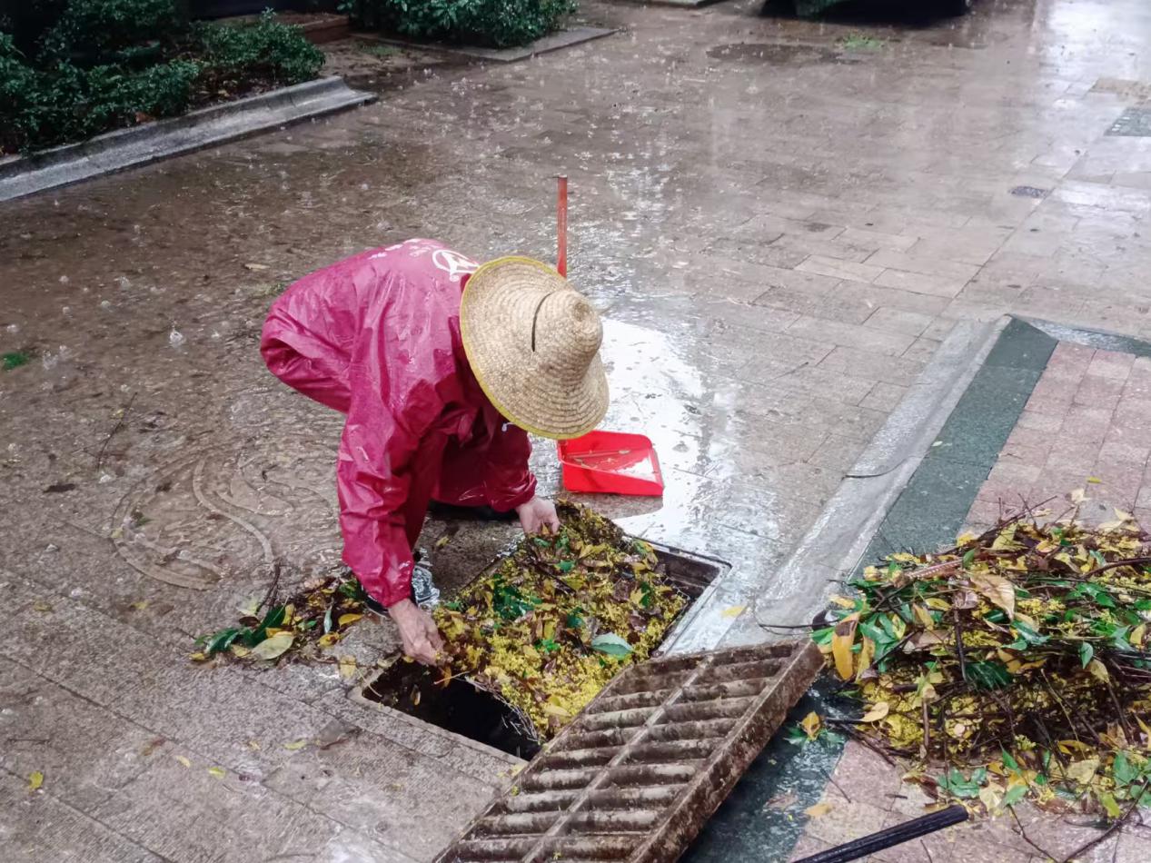 在溪山美地园、龙岸等小区,顺邦物业应急抢险队逆风而行,身披雨衣,化身"排水尖兵",徒手清除路面堆积的落叶等杂物。