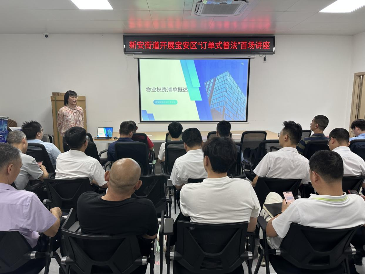 “专项维修资金要怎么使用?”“小区内的僵尸车能处理吗?”“小区出现突发情况要怎么处理?”……近日,宝安区新安街道司法所携手街道城市建设办公室(物业)为物业从业人员室举办了一场宝安区“订单式普法”百场讲座。讲座以“物业权责清单概述”为主题,特邀宝安区“八五”普法讲师团资深讲师李嘉瑜律师担任主讲,为辖区的物业从业人员带来了一场“干货满满”的权责普及课,旨在彻底厘清权责边界,共建和谐宜居社区。