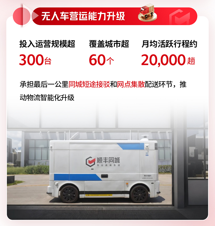 截至6月底,顺丰同城已有超过300台无人车在全国60多个城市投入运营,月均活跃行程约2万趟。