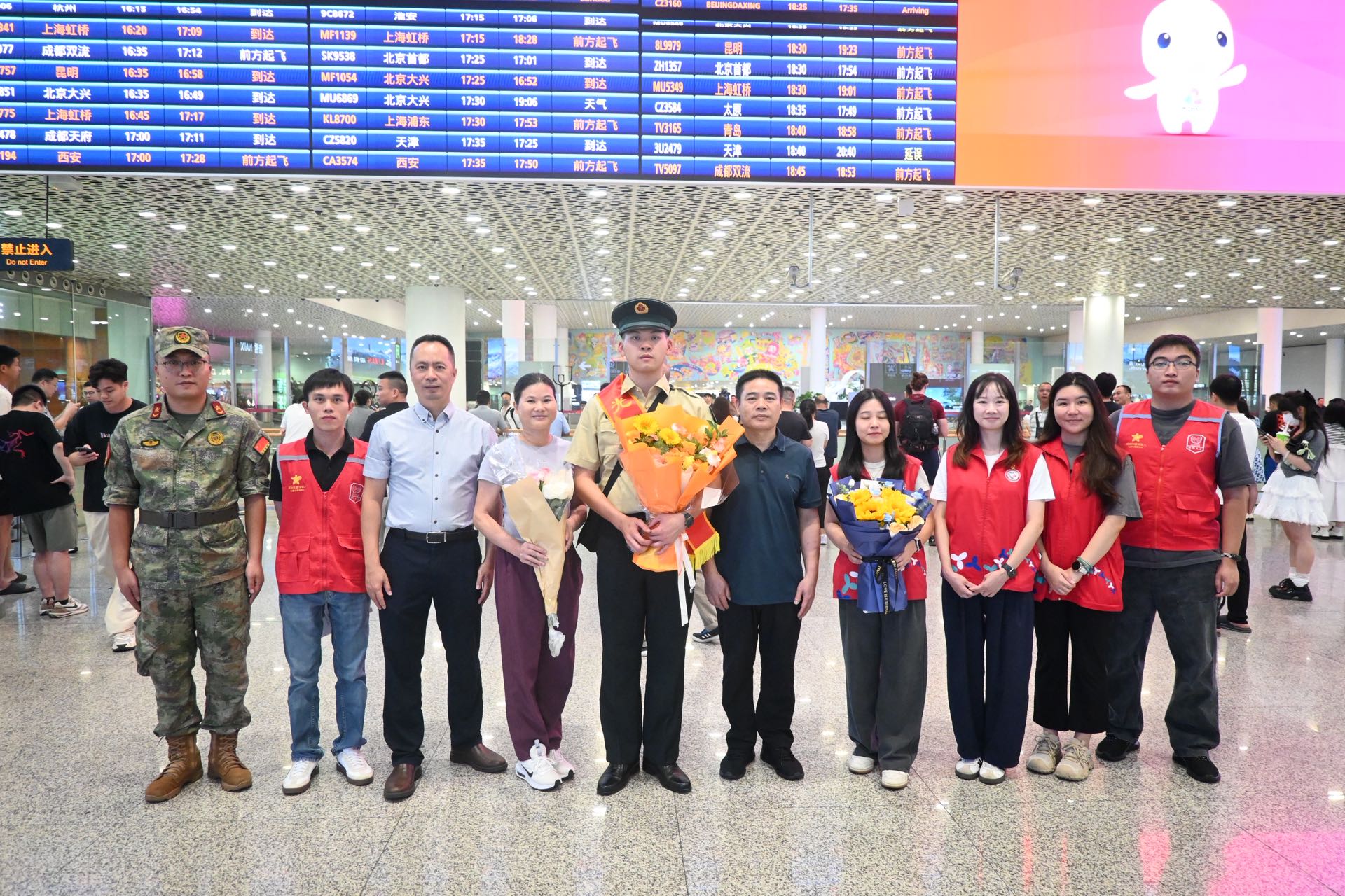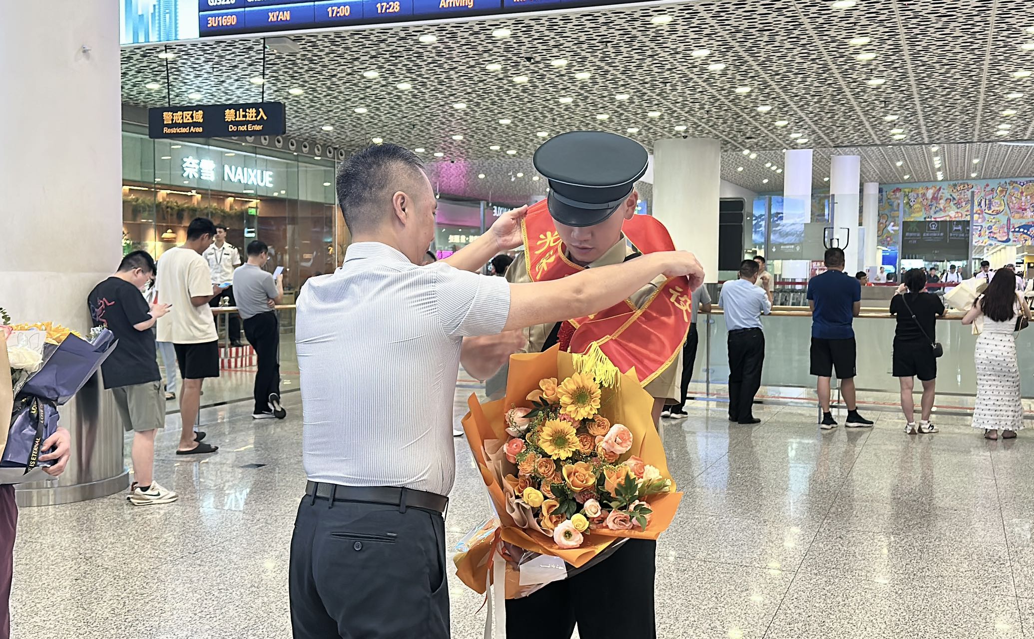 夜幕降临,接兵团依旧守候在机场到达大厅,当退役士兵张钦走出接机口时,温馨的场景再次上演。“没想到我坐晚班机回深圳,还有这么多工作人员和家人一起来接机,实在是太惊喜了!”退役士兵张钦洋溢着笑容说道。