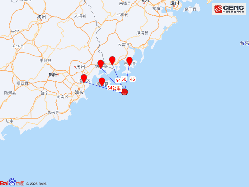 周边县城:震中距南澳县37公里、距福建东山县45公里、距福建诏安县50公里、距饶平县54公里、距澄海区64公里,距汕头市70公里。