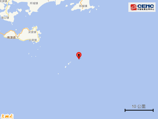 据中国地震台网正式测定,9月10日15时41分在广东汕头市南澳县海域发生3.8级地震,震源深度11公里,震中位于北纬23.30度,东经117.36度,距海岸线最近约30公里。