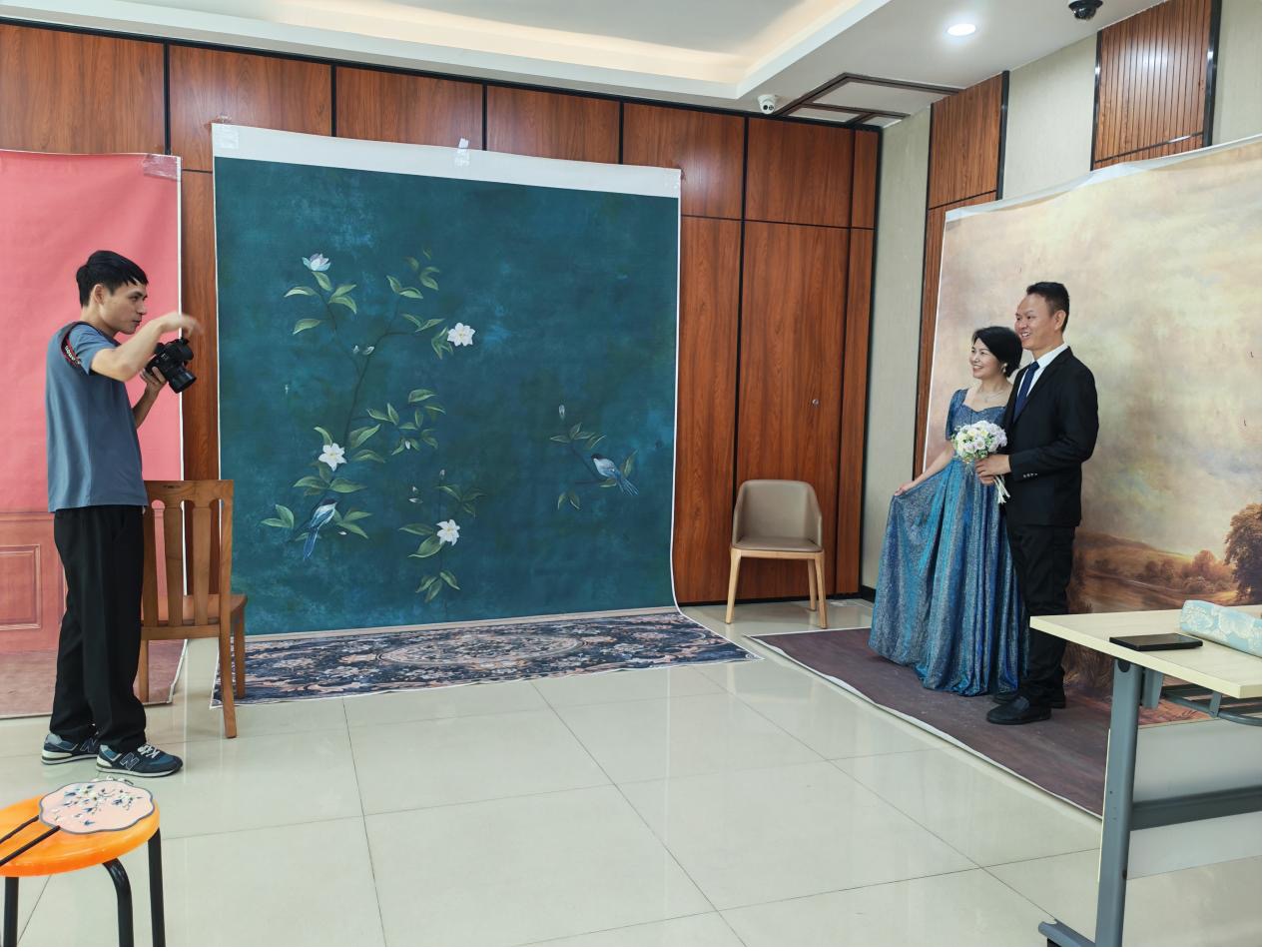 活动中,庄边社区“百姓客厅”变身“临时影棚”,摄影师们精心布置了中式屏风、军旅主题背景墙等场景,旗袍、婚纱、军装、西装等几十套服装整齐陈列,化妆师、社工团队准备就绪。从社工引导居民挑选服装、化妆师定制妆容,到摄影师耐心指导拍摄姿势,每个环节都凝聚着细致与温情。