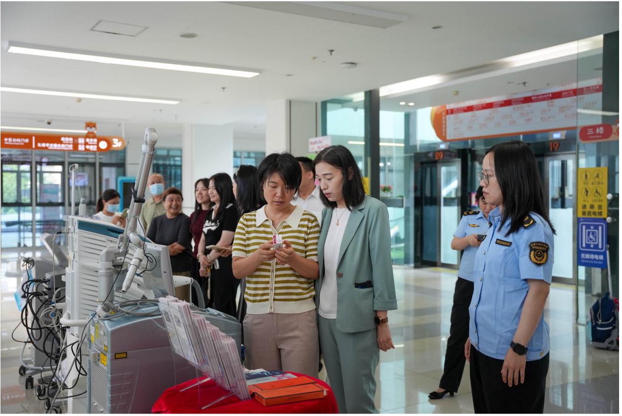 在妇幼皮肤科医美合规科普基地展区,宝安市场监管局工作人员化身“科普讲解员”,带领参会人员逐一参观展板与实物展示区:展板上,“医疗美容≠生活美容”几个大字显眼突出,资质要求、项目类别、常见产品、不良反应等内容清晰明了;在实物区里,玻尿酸、肉毒等耗材类产品及M22、超声炮等仪器类产品有序摆放,工作人员现场演示“看包装标识、查注册文号、辨生产信息”的辨别技巧,不少市民代表拿出手机拍照记录,“以前不知道怎么看产品真假,今天学会了,原来去美容院也可以辨别产品,来医院做医美项目更安全放心,太实用了!”市民王女士说。