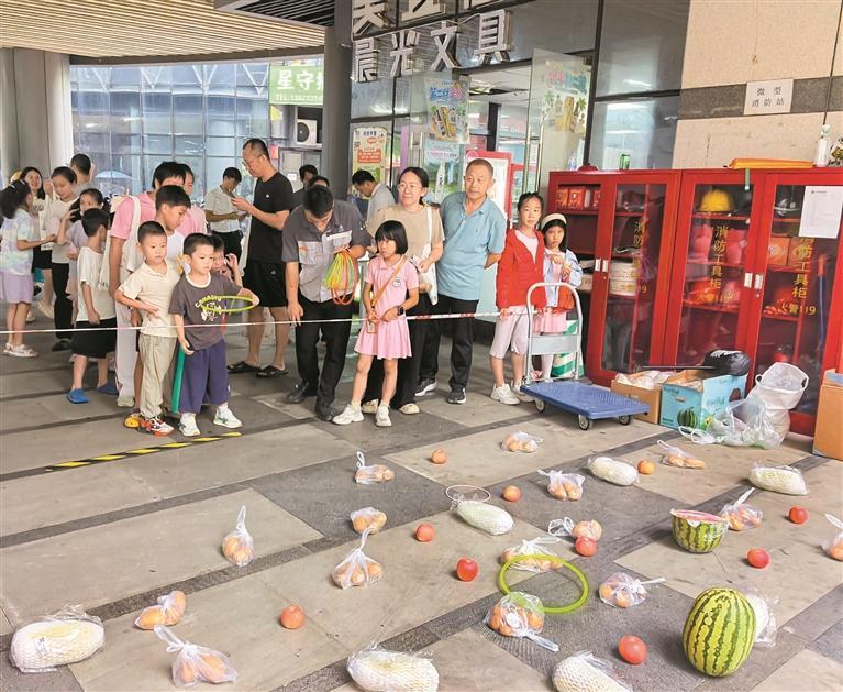 工作人员用风趣幽默的方式讲解绘本《对不起》。他们化身故事里的角色,模仿角色独特的语气,配上夸张又滑稽的肢体动作,逗得孩子们哈哈大笑。当讲到故事关键情节时,工作人员问,“大家想想,怎样道歉才是真诚的呢?”孩子们踊跃举手回答,在欢声笑语中悄然领悟宽容与担当的美好品质。“趣味套圈圈”游戏区人气十足,小朋友踮着脚尖奋力投掷,家长在旁边轻声指导,“瞄准大西瓜,慢慢来!”老年人手腕轻轻抖动,套圈划出优美的弧线。