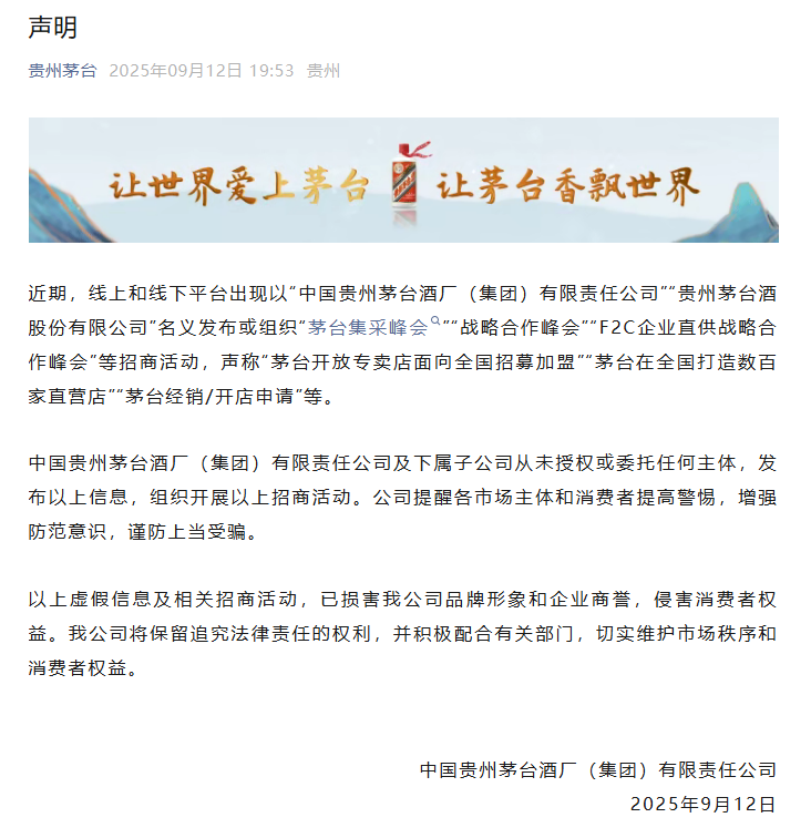贵州茅台酒厂(集团)公司及下属子公司从未授权或委托任何主体,发布以上信息,组织开展以上招商活动。公司提醒各市场主体和消费者提高警惕,增强防范意识,谨防上当受骗。
