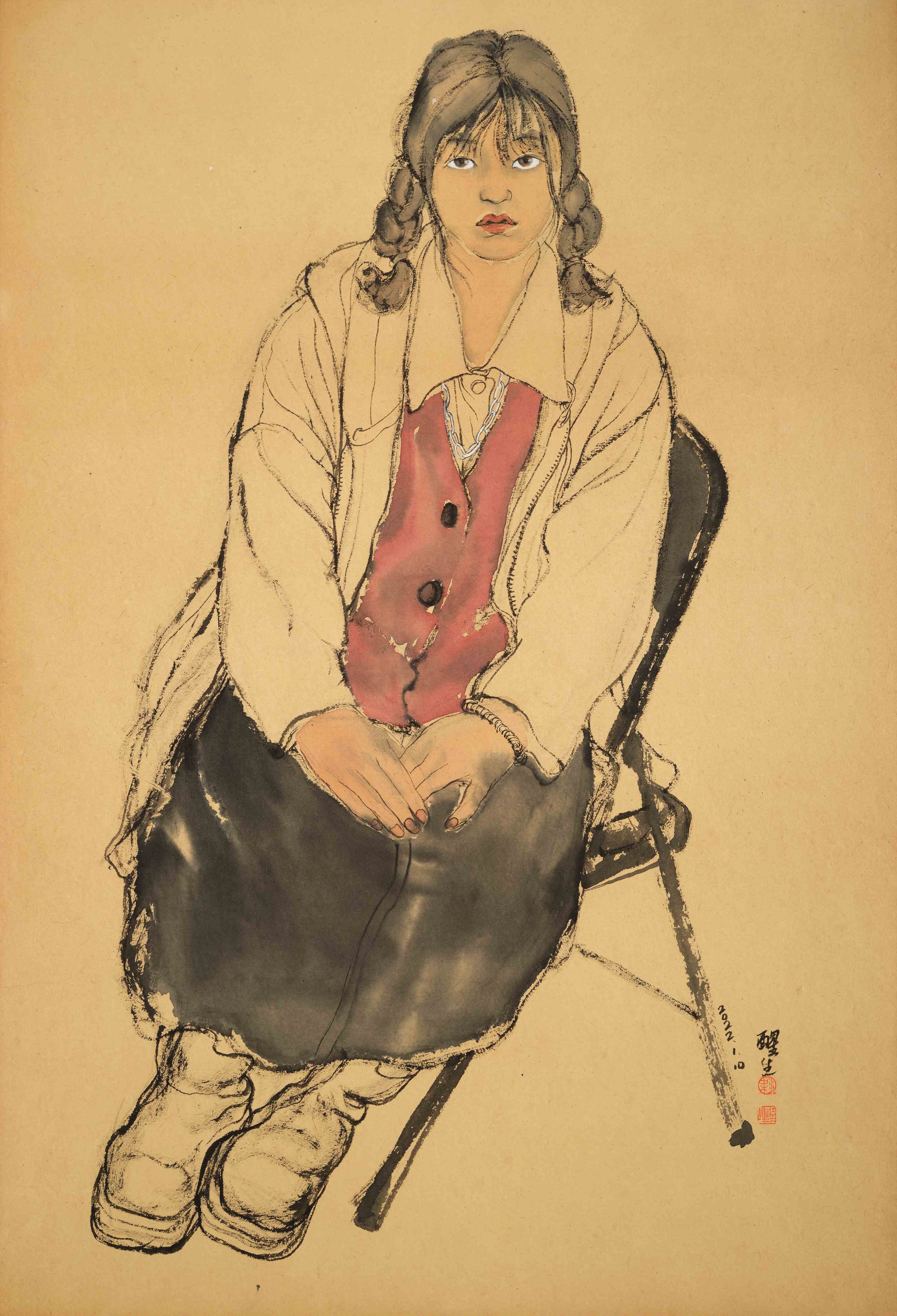 赖志强表示,梁醒生最近几年的画作与上一个十年的作品已然拉开了明显的距离。这可从以下两点观察到:一者,对水墨、色彩与线条的综合运用提升到了一个新状态。他在纯水墨人物画的探索基础上,进一步彰显色彩在画面上的效能;对水墨的运用不像过去那样追求笔触块面,而是追求墨随形变渗散开来的独特肌理的趣味性;线条则舍弃过往的厚重感,转向细密谨劲的质朴感。二者,绘画主题将目光回落平凡个体身上,聚焦于身边的人物。
