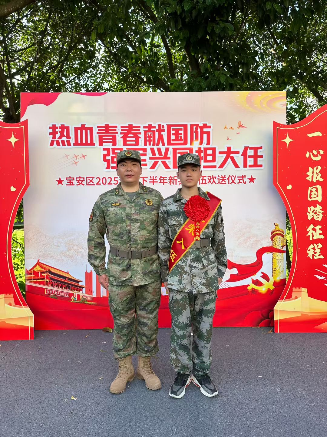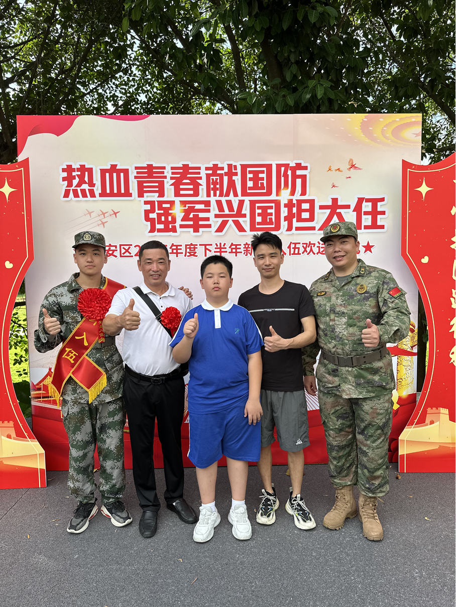 9月12日,在西乡街道2025年下半年新兵入伍欢送活动现场,庄边社区民兵连政治指导员李升平与即将入伍的堂弟紧紧相拥,身旁的叔叔眼中闪烁着欣慰的泪光。叔侄几人共同拍摄了一张新的合照,记录了一个家庭几代从军的感人传承。
