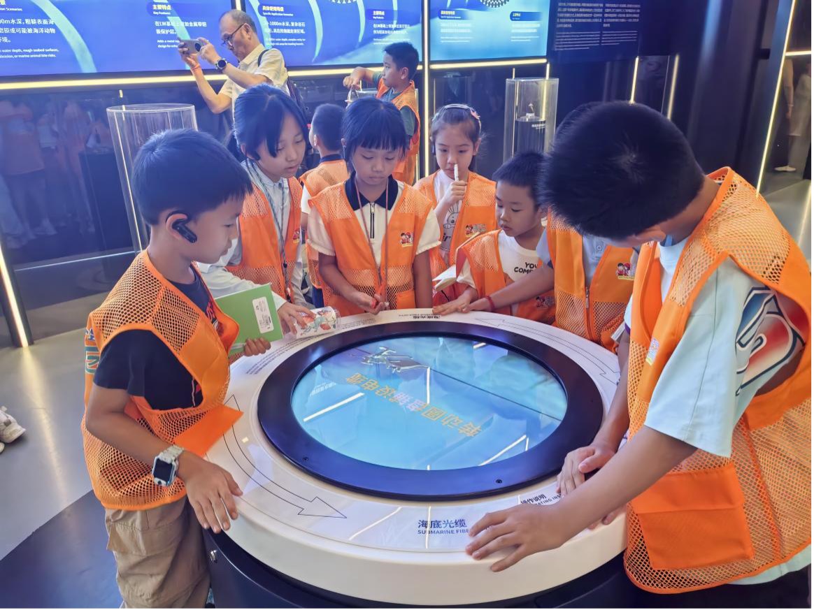 四层“智慧产业”展厅,聚焦深圳“20+8”产业集群,展示了深海探测、智能制造、5G港口等前沿科技成果。在这里,小记者们见到了1:1还原的万米深潜器“奋斗者号”,讲解员告诉大家我国自主研制的“奋斗者号”创造了诸多奇迹——成功坐底10909米深海并带回海沟底部的岩石、生物等珍贵样品,创造了中国载人深潜新纪录;世界上首次同时将3人带到海洋最深处;历时157天圆满完成首次环大洋洲(22000余海里)载人深潜科考航次任务,大家禁不住啧啧称奇。现场展示的我国首款拥有完全自主知识产权的航空发动机CJ-1000A模型,其精妙设计更让小记者“为祖国强大感到无比自豪”……
