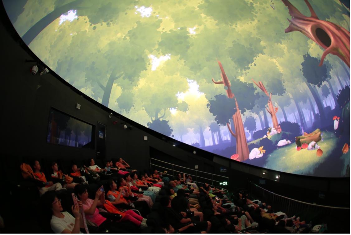 影院面积约303平方米,12米直径的蓝色穹顶倾斜23度,50个星轨式排布座位让大家可舒适仰卧,全身心沉浸于星空之中。6K激光影像配合环绕立体声,瞬间将小记者带入浩瀚宇宙。