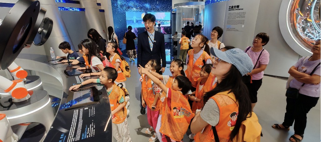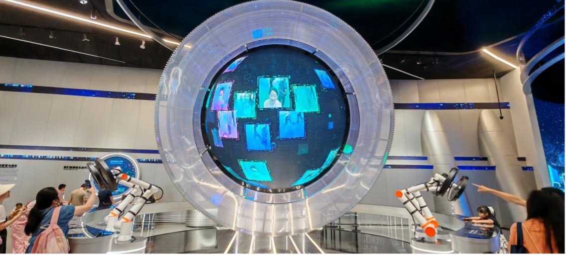 二层“你好,世界!”展厅,带小记者们进入数字文明的世界。入口处的机械臂,每个里面都有AI小精灵,通过电子眼与小记者互动,瞬间互动场面便被投影到对面的大屏上;而在“智慧生活的一天”展项,数字技术改变人们的生活方式,让人与人、人与世界之间的互动焕然一新,小记者们在此体验火星基地的虚拟探险、月球基地的研学之旅,抑或乘坐无人驾驶航空器一览未来城市风光,又或者“亲临”穿梭机餐厅、解密“智慧办公”“智慧医疗”等图景……