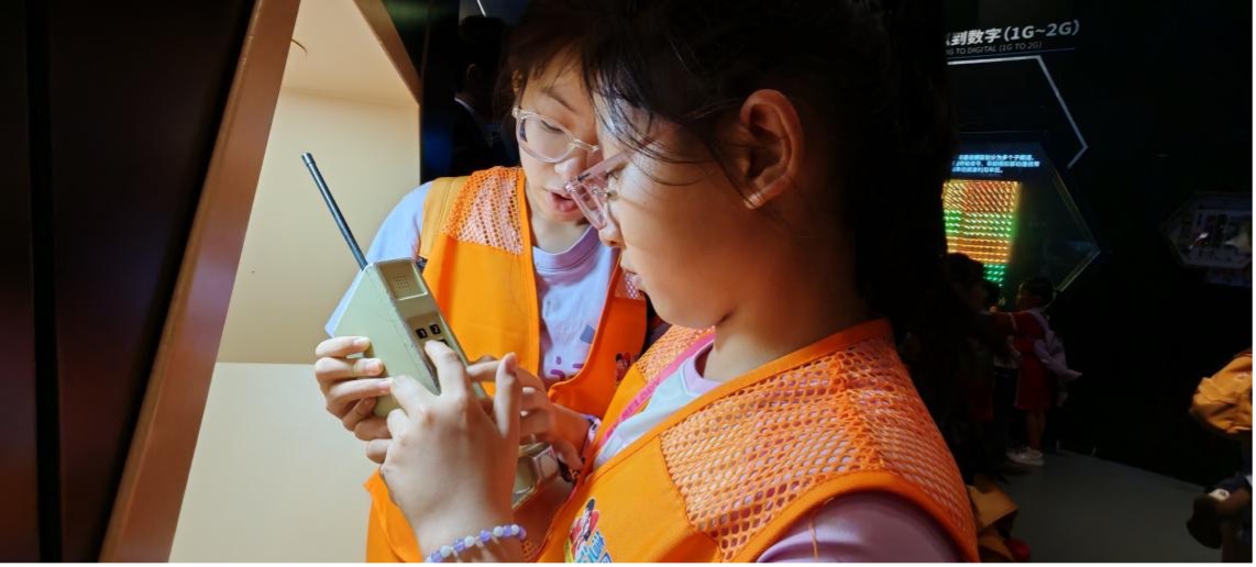 三层“美好生活展厅”,借助人工智能大模型和人形机器人,还原交通、家庭、社区等生活场景的科技进化。小记者们穿梭期间,在专业讲解员的陪同介绍下,了解到人类口语的进化、古代信息传递(狼烟),以及1G到5.5G到6G现代通信方式的迭代升级,掌握到手机天线“消失”的秘密;或者亲手拨动数字按钮,观察灯光流动如何模拟数据传输,秒懂计算机用0和1就能表示所有字母的神奇逻辑……在这里,科技不再是冷冰冰的概念,而是融入生活,带来无限便利。