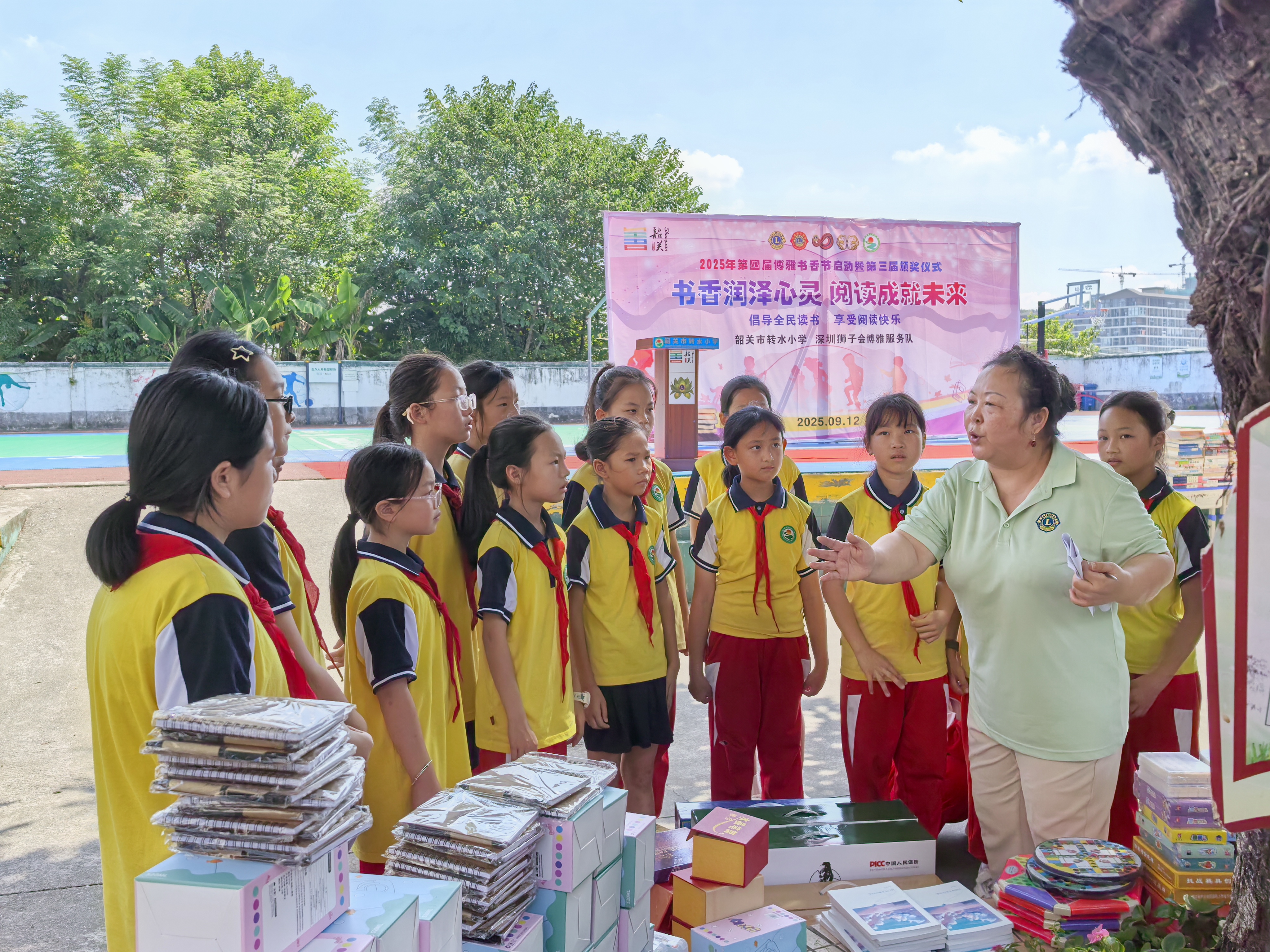 9月12日上午,服务队一行赴韶关市转水小学举行第四届“博雅书香节”启动仪式。现场捐赠了涵盖文学、科学、历史等类别的图书及文具、体育用品,并为第三届书香节中评选出的“阅读之星”“书香家庭”和优秀指导教师颁奖。获奖学生代表表示,书籍让自己看到了山村之外的广阔世界。