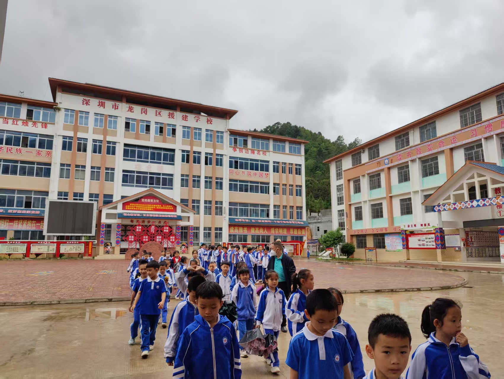 在那坡县,一所名为“深龙小学”的现代化学校,已成为粤桂协作的亮丽名片。校名中的“深”取自深圳,“龙”代表龙岗,寓意两地情深、协作腾飞。面对易地搬迁后县城就学压力骤增的难题,龙岗区投入数千万元,于2019年建成这所可容纳1500名学生的小学。如今,校园内教学楼、功能室、食堂设施齐全,书声琅琅。办学六年来,深龙小学已荣获自治区“民族团结进步示范单位”等多项荣誉,从一所解决燃眉之急的安置校,成长为一所有民族韵、书香味、正能量的品牌校,真正成为了点亮山区孩子求学路的希望之光。
