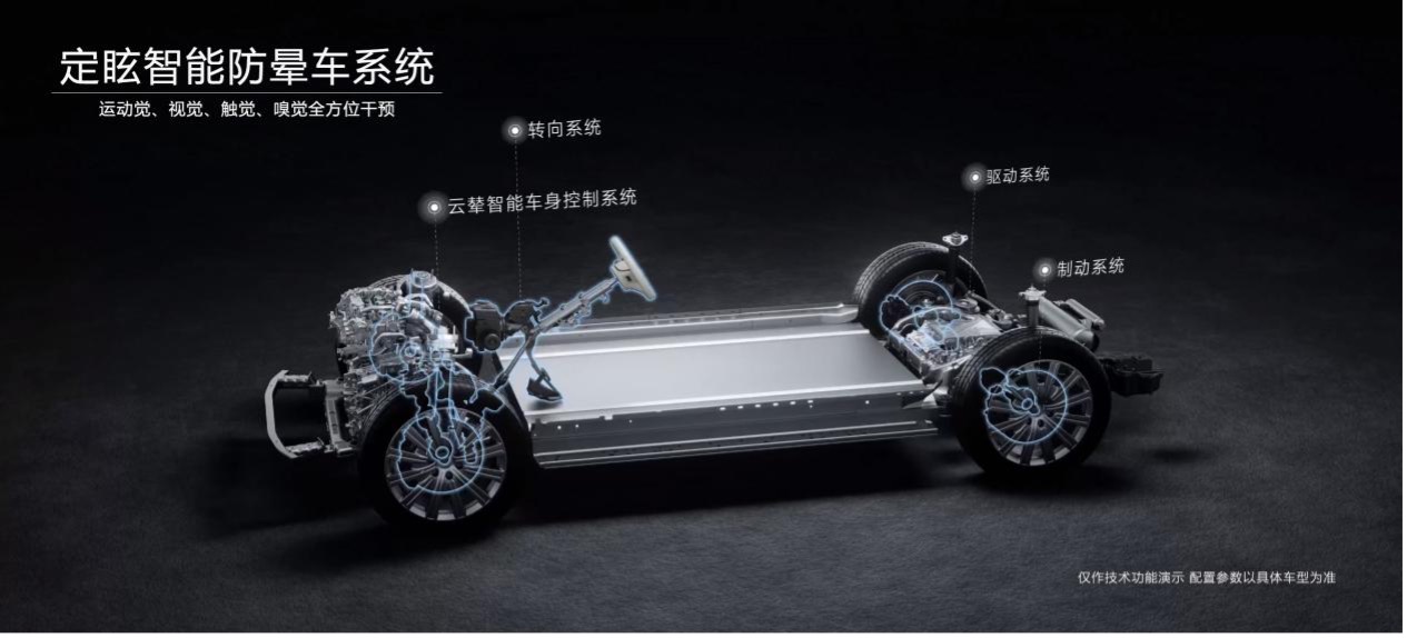 腾势N9搭载定眩智能防晕车系统,并已通过“中汽中心”、“中国人民解放军空军特色医学中心”的严苛认证,该系统以云辇智能车身控制系统为核心,通过联动底盘、动力、座舱三大系统,实现对运动觉、视觉、嗅觉、触觉等全方位干预,让用户告别晕车。