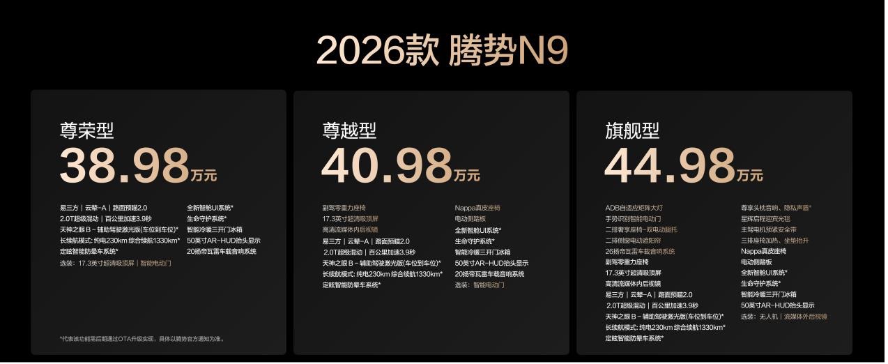 9月17日晚,2026款腾势N9正式上市,共推出尊荣型、尊越型、旗舰型3款车型,官方指导价38.98万元~44.98万元,解锁极致豪华新体验。