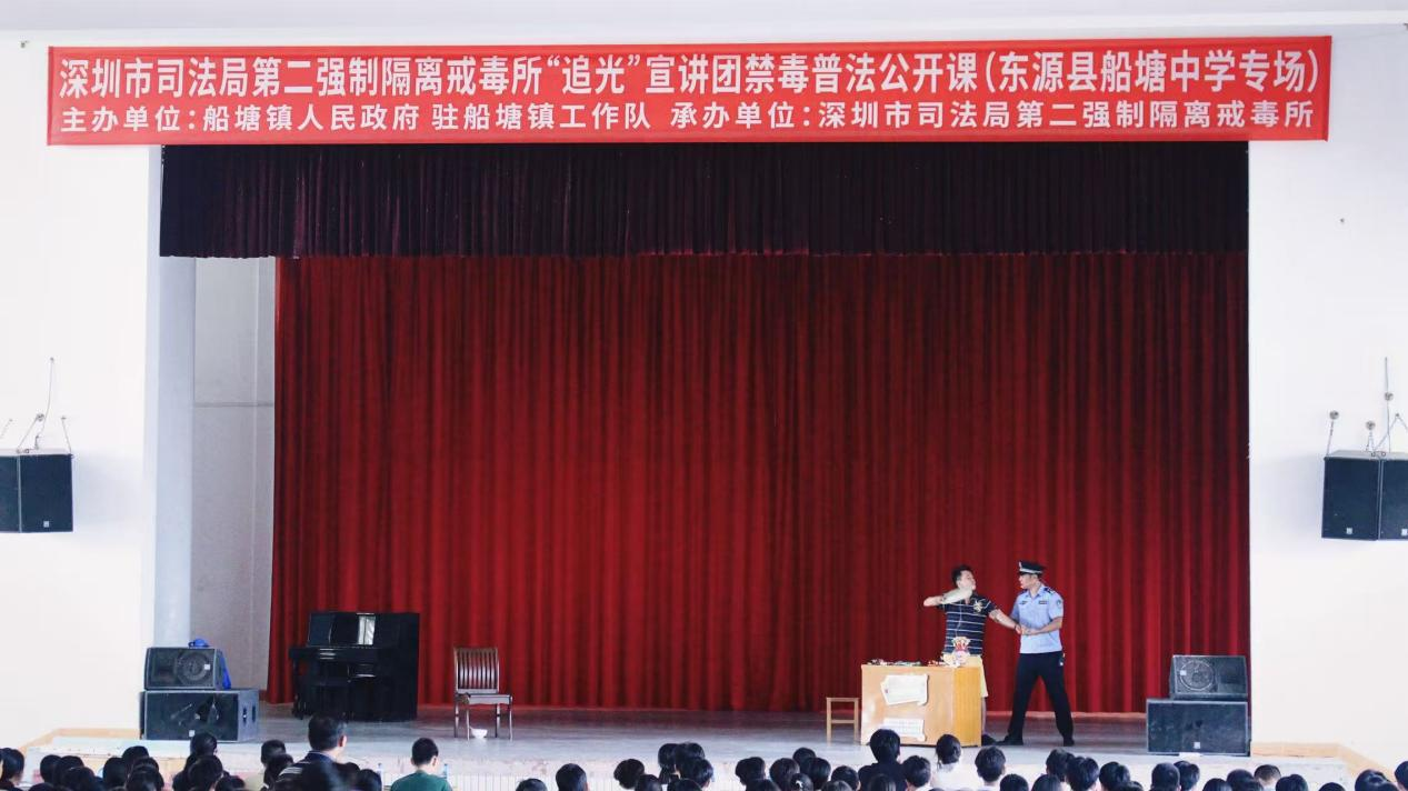 为深入贯彻禁毒宣传教育进校园工作要求,增强青少年禁毒意识,提升乡村学生识毒、防毒、拒毒能力,近日,受深圳市直机关工委邀请,深圳市司法局第二强制隔离戒毒所“追光”禁毒实践服务团队赶赴河源市东源县船塘中学,为全校师生带去一堂别开生面的禁毒普法“开学第一课”。