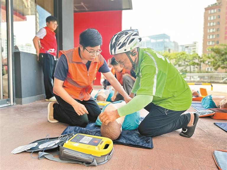 9月17日上午,福城街道社区建设促进会承办的“2025年龙华区平安创建专项经费项目——新业态从业者平安赋能项目”在福城街道大水坑社区开展,30余名美团骑手围在急救模拟人旁,专注练习心肺复苏操作。