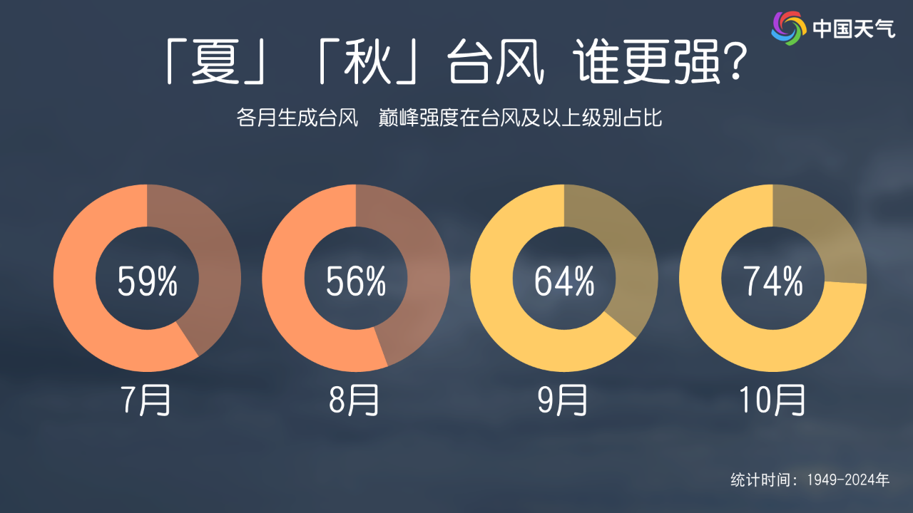 因为海温高,9月是台风高产月,台风强度往往也更强。从往年来看,秋台风巅峰强度在台风及以上级别的占比比盛夏7-8月明显偏多。
