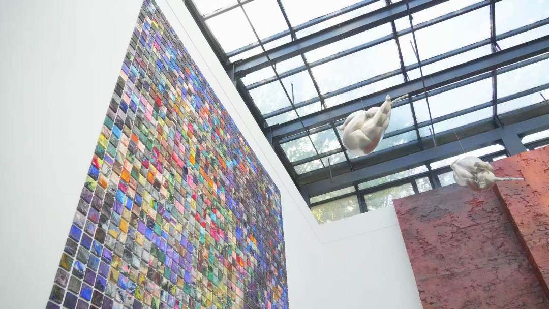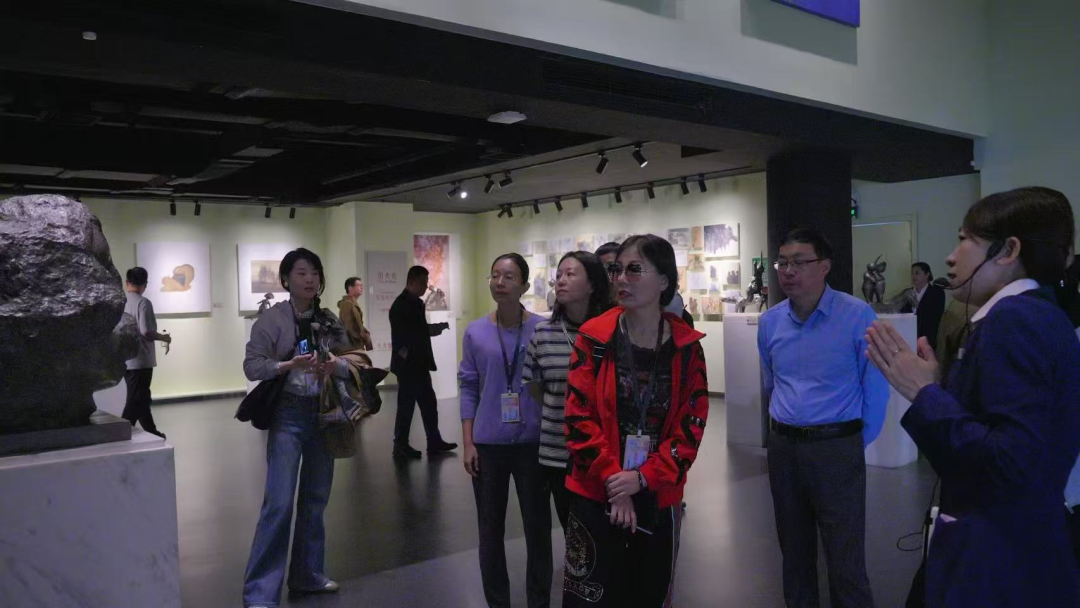 一行人来到2023年揭幕的殷小烽雕塑艺术馆。这座建筑面积3400平方米的场馆,以2745件作品构建起艺术家的视觉谱系。在旋转楼梯处,1600幅综合材料绘画《万物生长》系列令人震撼——嬷嬷人形象与珊瑚形态交织,将满族剪纸艺术与自然哲学融为一体,传递“天人合一”的古老智慧。