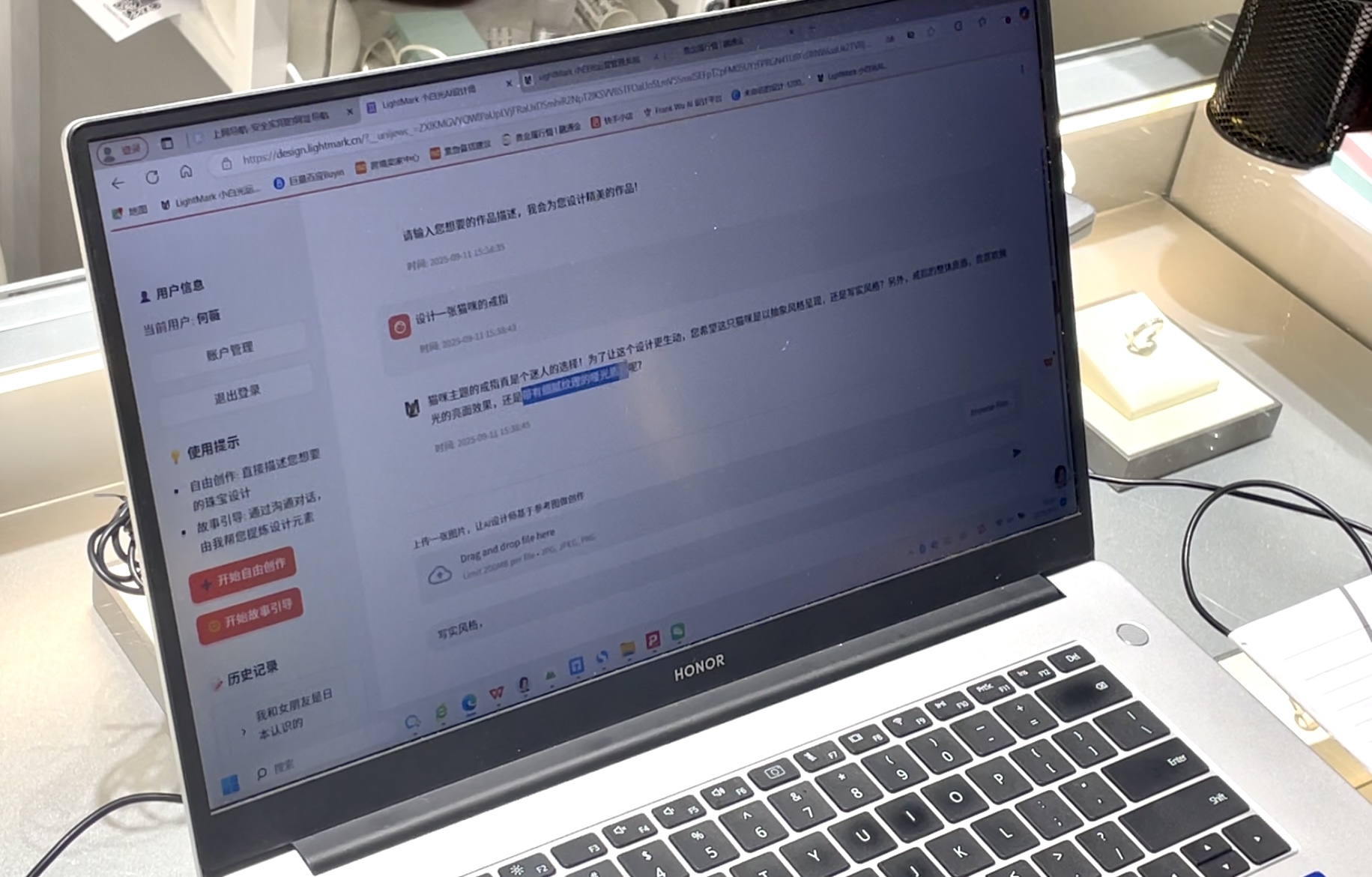 据了解,小白光推出的多项创新服务中最吸引年轻人的是AI设计定制服务。企业通过自研专项软件,可根据消费者要求,输入戒面形状、镶嵌款式、颜色大小等个性化需求,生成专属设计;同时提供“故事模板”模式,消费者可描述一段纪念性经历,AI据此归纳并设计出多款独创产品,最终实现完全符合想象的设计。借助AI辅助,设计时长可缩短至5分钟,现场便能定稿投入制作。“你自己给自己设计一个钻戒,这个功能已经实现了。”