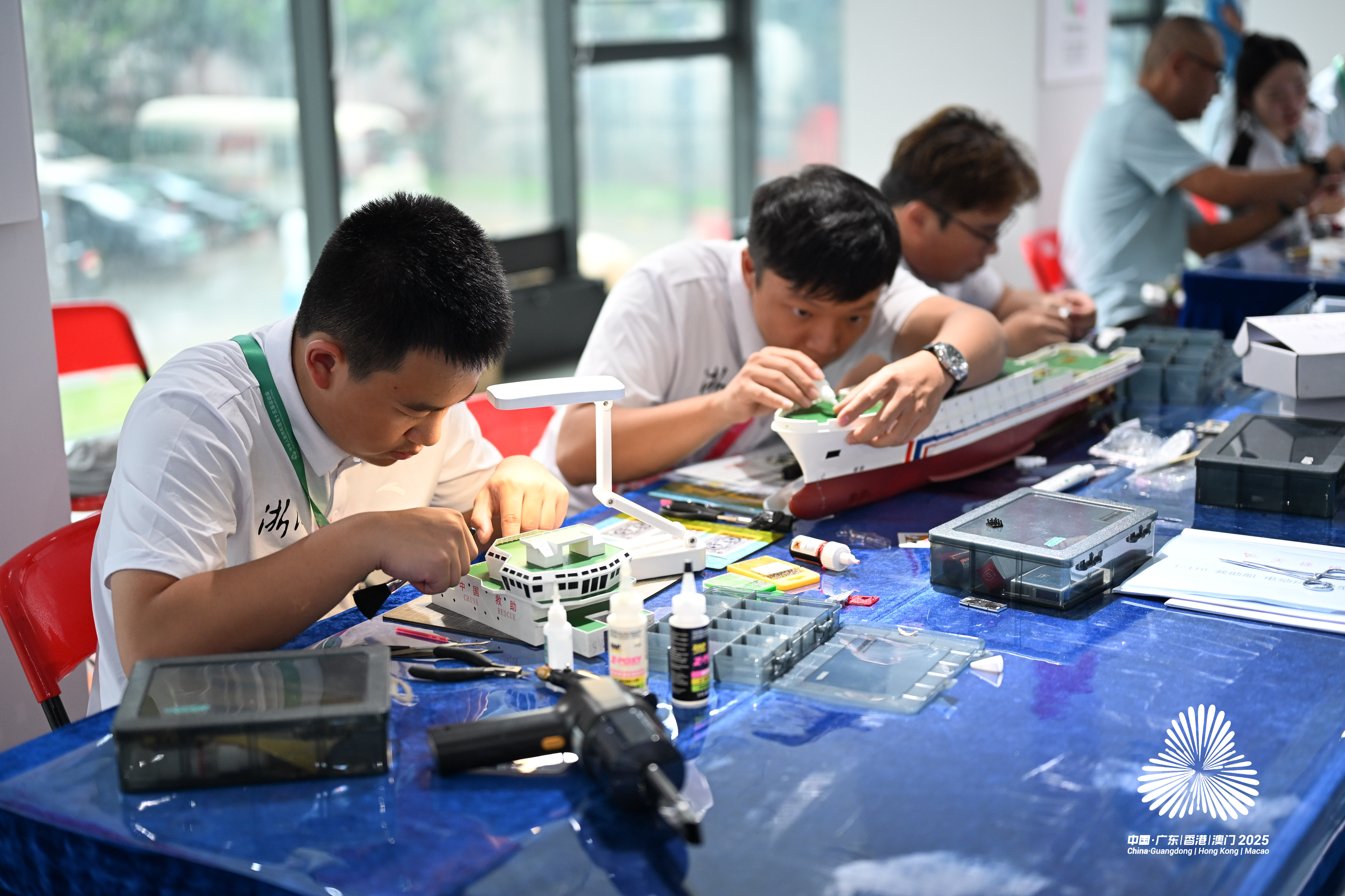 另一边,参加航海模型仿真航行项目的选手们正紧张地合力制作比赛中的仿真船模型,并进行安装、修饰、打磨、调试……最终下水进行正式竞赛。据悉,比赛所用仿真船模的原型,均为中国自行设计建造(改造)、投入使用的海军舰艇、科考船、救援船及特种船舶等,兼具历史厚重感与科技代表性。