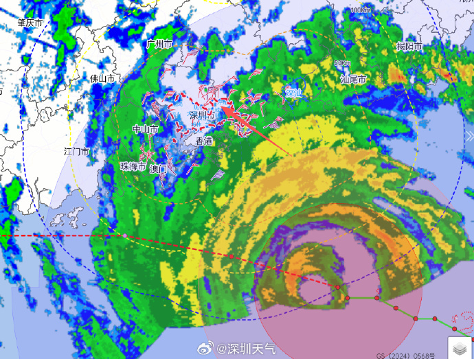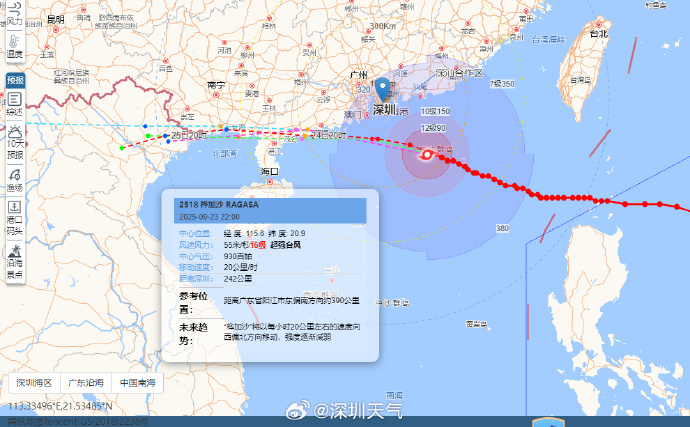 从路径预报来看,大概率于24日(本周三)以超强台风级在深圳南侧近距离掠过,不排除在珠江口附近登陆的可能。