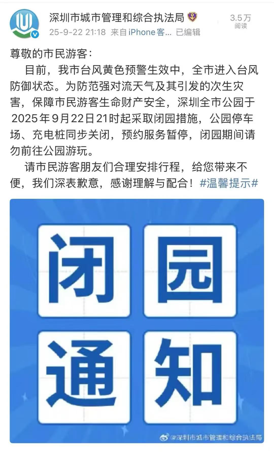 深圳市公园管理中心发布消息:为防范强对流天气及其引发的次生灾害,保障市民游客生命财产安全,深圳全市公园于2025年9月22日21时起采取闭园措施,公园停车场、充电桩同步关闭,预约服务暂停,闭园期间请勿前往公园游玩。
