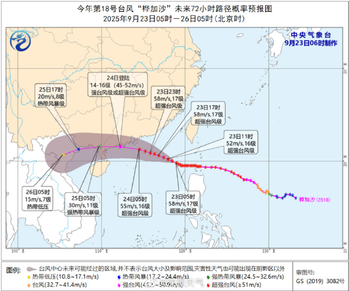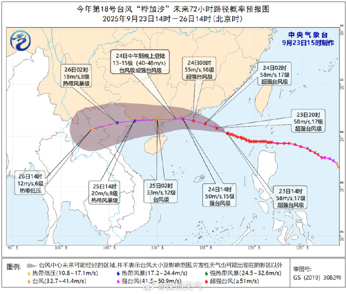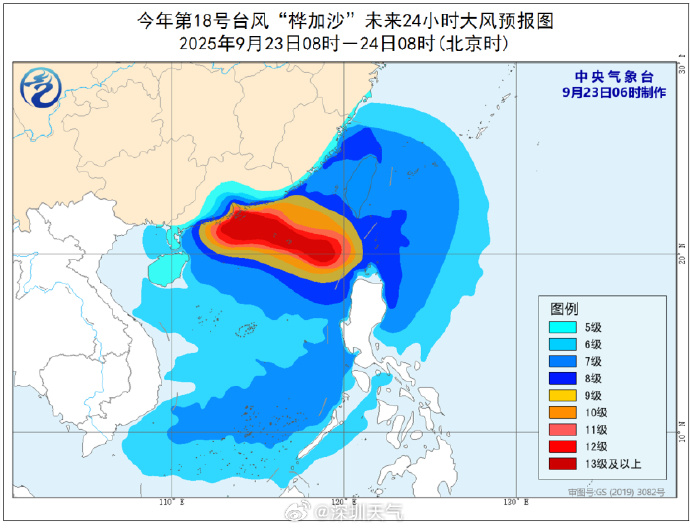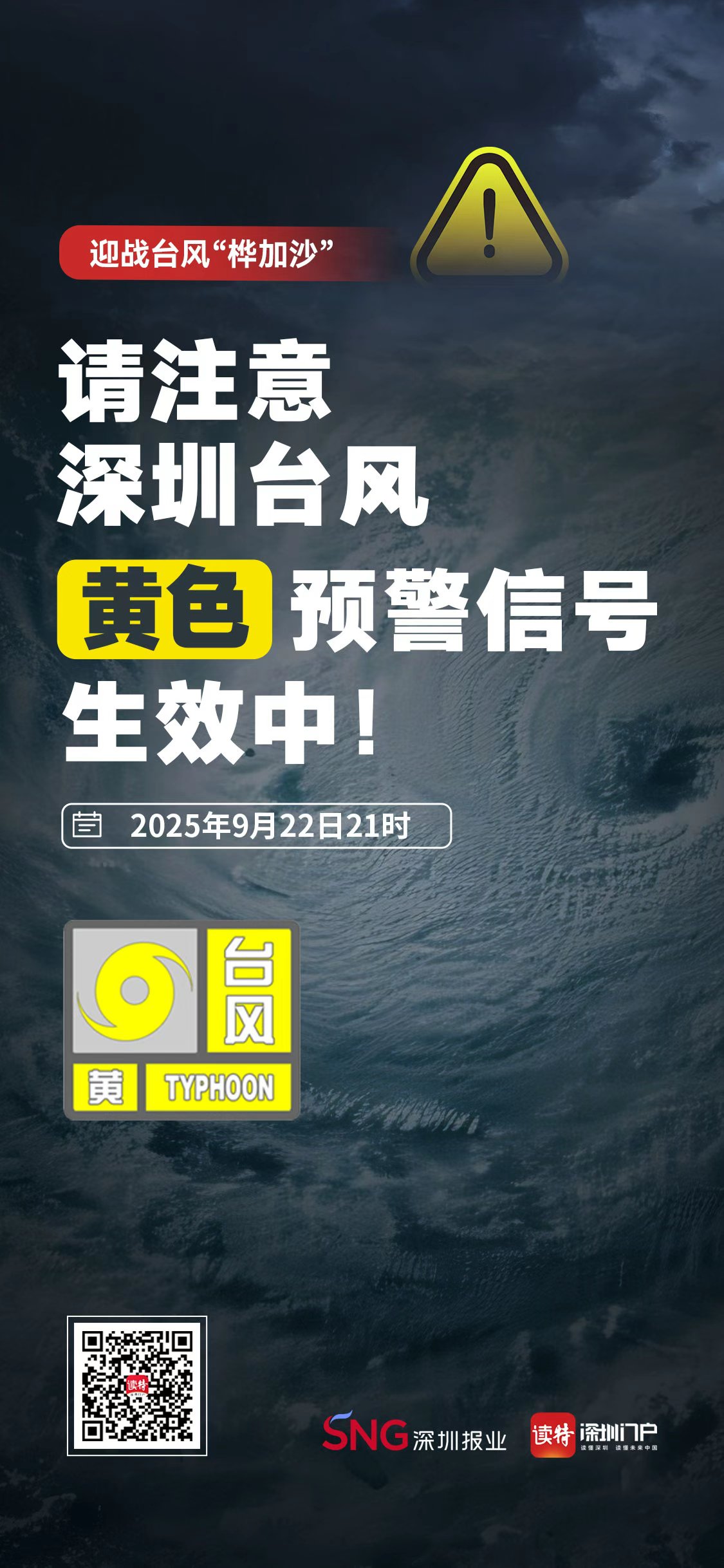 第18号台风“桦加沙”(超强台风级)已进入我市500公里范围,预计未来趋向广东中西部沿海,24日较大可能在我市近海掠过。我市23日午后风雨逐渐加大,23日夜间到24日是风雨最强时段,致灾风险极高。深圳市气象台2025年9月23日10时将全市台风黄色预警信号升级为橙色,请注意做好台风和暴雨的防范工作。