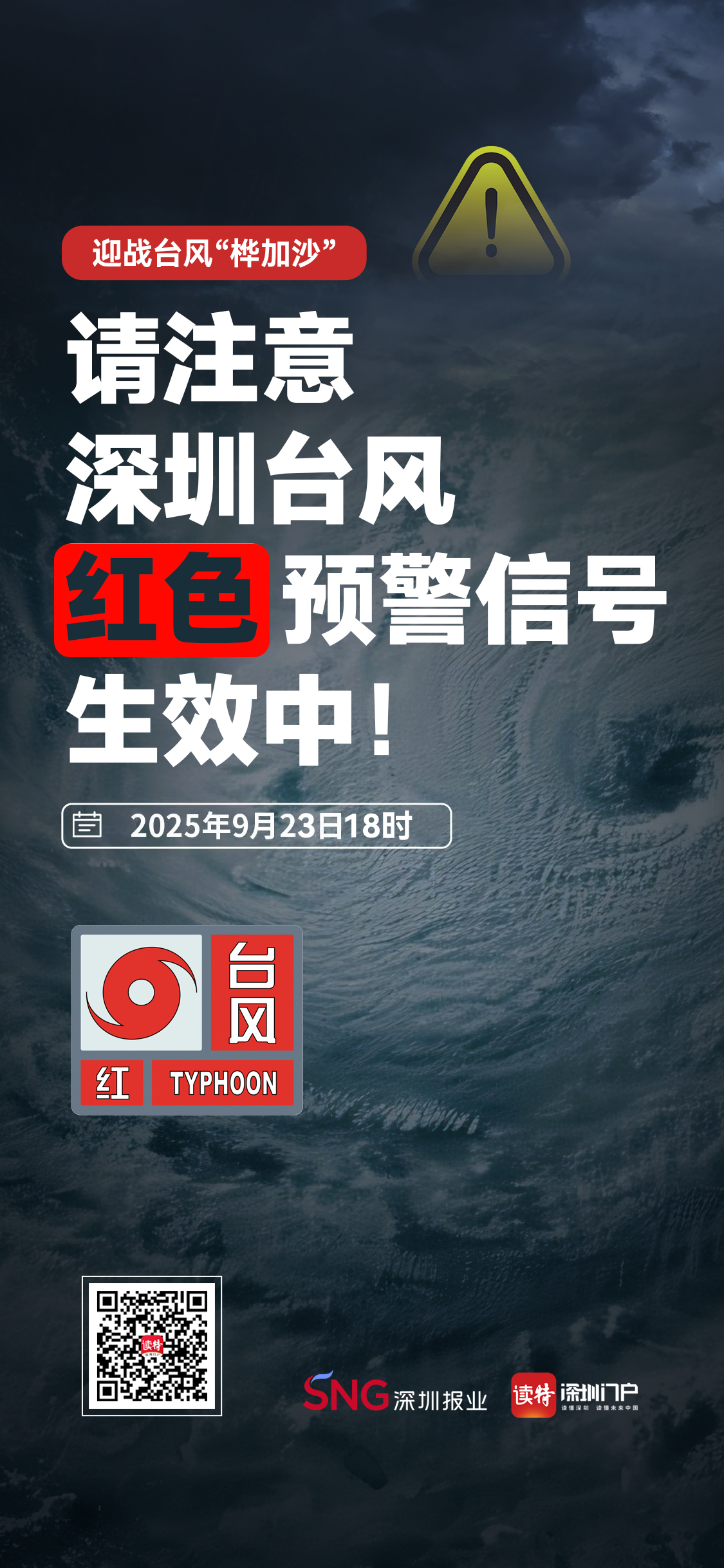 预计第18号台风“桦加沙”(超强台风级)未来趋向珠江口西侧沿岸,23日夜间到24日上午较大可能以超强台风级在我市南侧100-200公里近海掠过。23日傍晚前后我市自东向西风力逐渐增大,23日夜间到24日是风雨最强时段,致灾风险极高。深圳市气象台2025年9月23日18时将全市台风橙色预警信号升级为红色,请注意做好台风和暴雨的防范工作。