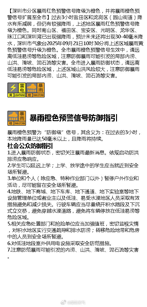 过去3小时盐田区和龙岗区(园山街道)降水有所减弱,但仍有较强降雨,上述地区暴雨红色预警信号降级为橙色。同时南山区、福田区、宝安区、光明区、龙华区、珠江口和深圳湾已出现强降雨,预计未来还将出现30-40毫米降水,深圳市气象台2025年09月21日10时30分将上述区域暴雨黄色预警信号升级为橙色。全市暴雨橙色预警信号生效中,请远离低洼易涝等危险区域,注意防御暴雨可能引发的局部内涝、山洪、滑坡、泥石流等灾害。全市进入暴雨防御状态,请远离低洼易涝等危险区域,上述区域山洪风险较大,注意防御暴雨可能引发的局部内涝、山洪、滑坡、泥石流等灾害。