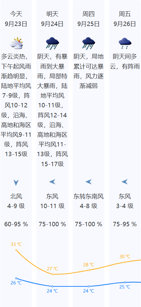 预计深圳(含深汕)23日午后风雨逐渐加大,23日夜间到24日是风雨最强时段,24日最大阵风陆地可达12-14级,沿海、海区和高地可达15-17级,并伴有全市性大暴雨,局地特大暴雨。25-26日风雨逐渐减弱。