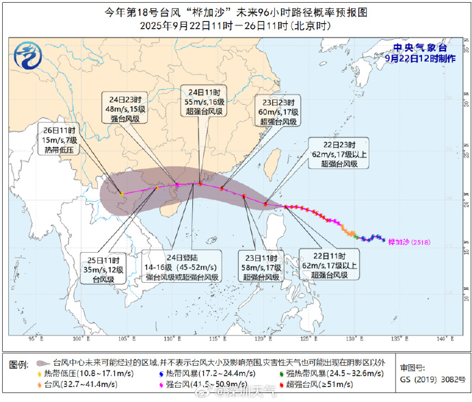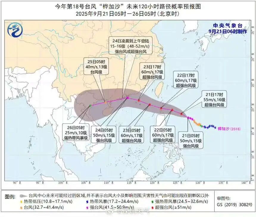 预计第18号台风“桦加沙”(超强台风级)趋向广东中部沿岸,23日夜间-24日我市有狂风暴雨,致灾风险极高。深圳市气象台将于2025年9月21日18时发布深圳陆地和海区台风白色预警信号,请注意做好台风防御工作。