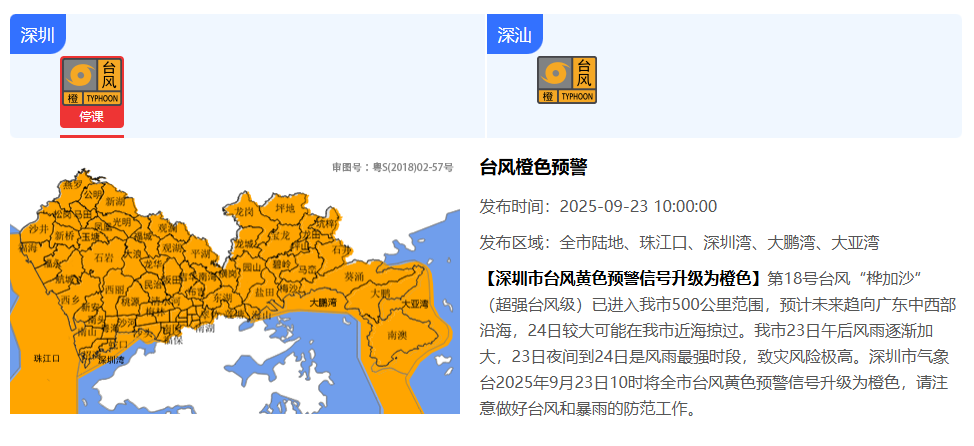 预计第18号台风“桦加沙”(超强台风级)趋向广东中西部沿岸,即将进入我市500公里范围,我市23日午后风雨逐渐加大,23日夜间到24日是风雨最强时段,致灾风险极高。深圳市气象台将于2025年9月23日10时将全市台风黄色预警信号升级为橙色,请注意做好台风和暴雨的防范工作。