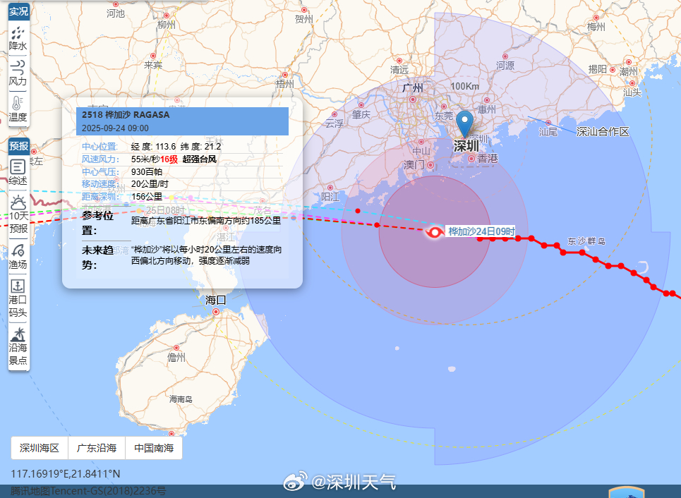 “桦加沙”预计24日以超强台风级在深圳南侧近距离掠过