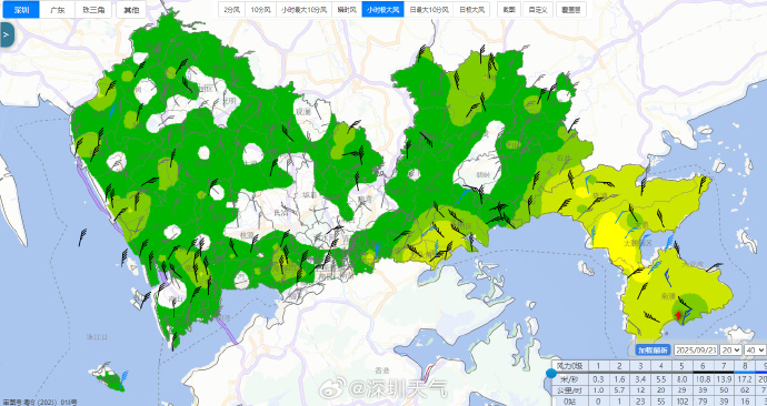 过去1小时深圳记录到小雨降水,风力逐渐增大