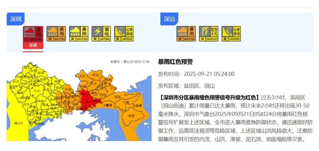 目前我市盐田区、龙岗区(园山街道)暴雨红色预警信号,罗湖区、大鹏新区、龙岗区、坪山区、大鹏湾、大亚湾、深汕特别合作区暴雨橙色预警信号,南山区、福田区、宝安区、光明区、龙华区、珠江口和深圳湾暴雨黄色预警信号,全市雷电黄色预警信号生效中。