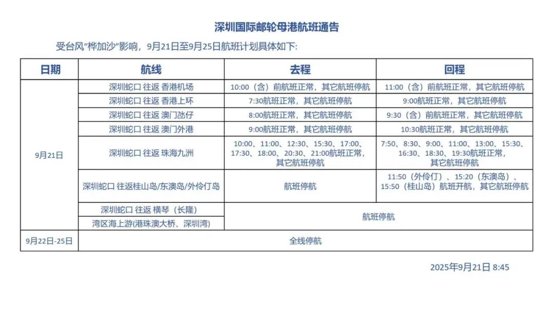 另外,受台风影响,深圳机场码头9月21日至9月25日所有船班停航。旅客可在港口发布有关停航通知之日起30个自然日内,联系购票平台办理全额退票退款。